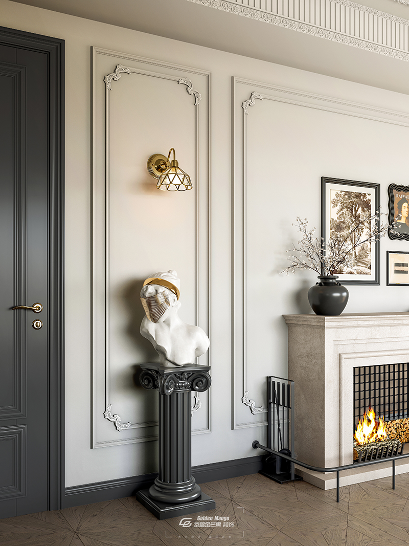 墻面有精致護(hù)墻板與裝飾壁燈,搭配雕塑、壁爐及裝飾畫,整體風(fēng)格偏藝術(shù)、典雅,營造出富有格調(diào)的氛圍,用于日常休憩、交流,展現(xiàn)屋主對生活美學(xué)的追求,是家中兼具美觀與功能的公共活動區(qū)域。