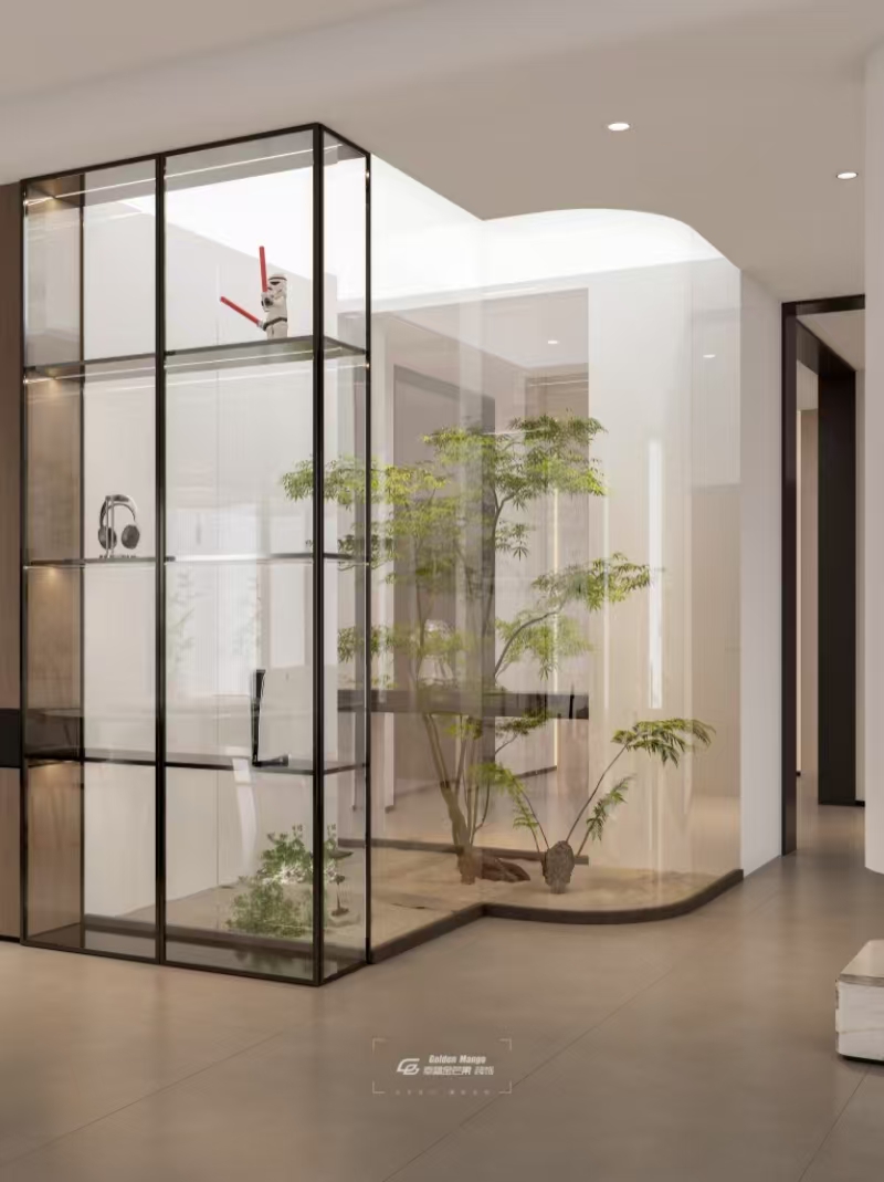 弧形墻體柔化空間棱角,玻璃隔斷框住微型景觀,松石、綠植與藝術擺件共生。踏入玄關,仿佛走進自然與藝術編織的詩意小徑,卸下疲憊,讓家的溫柔,從第一步就緊緊包裹身心,把門外的紛擾,都留在這方小天地之外。