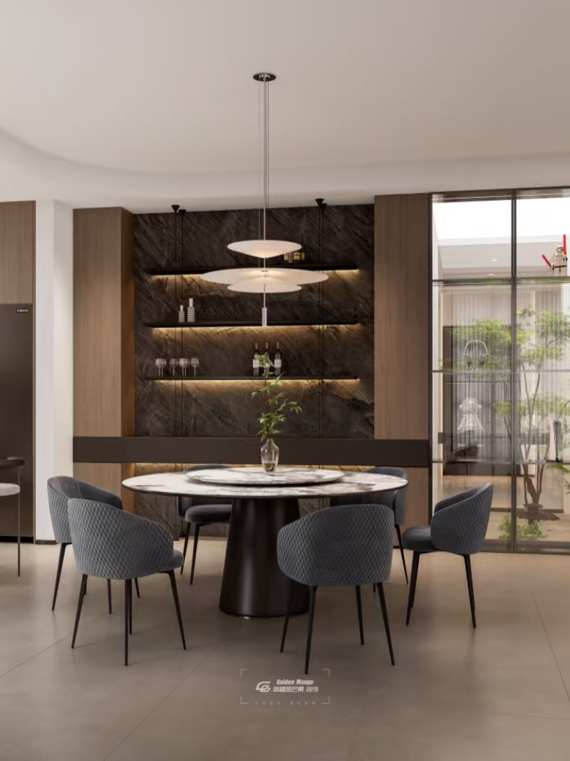 云南金芒果裝飾昆明恒大城現代裝修風廚房深灰巖板背景墻與木質柜體碰撞,嵌入式燈帶暈染溫馨,圓形餐桌搭配簡約吊燈,大理石紋理藏著自然詩意。用餐時,窗外城市燈火與室內暖光交融,家人圍坐,餐具輕響,把煙火日常過成精致儀式,金芒果裝飾能讓你每一頓飯,都是對生活的深情告白。