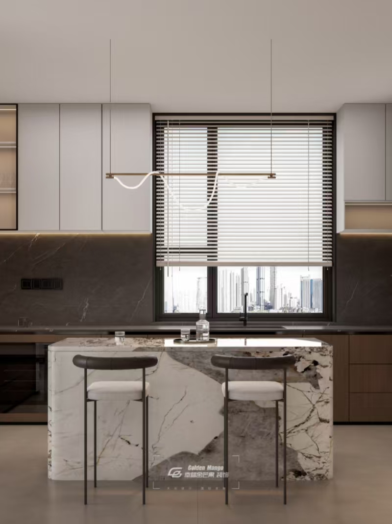 淺灰櫥柜與深灰巖板碰撞,勾勒出利落的幾何線條,中島臺的大理石紋理似一幅流動的山水長卷。垂墜的藝術吊燈,為備餐時光暈染溫馨光暈。百葉窗輕掩,將城市天際線框成窗景,在這里,烹飪不再只是家務,而是與家人分享煙火、品味生活的浪漫儀式,每一次舉杯,都藏著對平凡日常的熱愛。