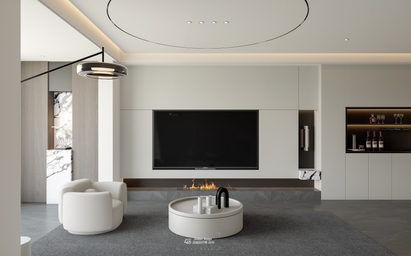 整體簡約規(guī)整,大白墻嵌入巨幕電視,下方嵌入式壁爐添溫馨。一旁柜體結(jié)合開放與封閉收納,陳列酒杯、酒瓶等,兼具實(shí)用與裝飾。白色單人沙發(fā)呼應(yīng)風(fēng)格,天花板圓形線條延續(xù)空間設(shè)計語言,營造簡潔大氣且有生活感的環(huán)境。