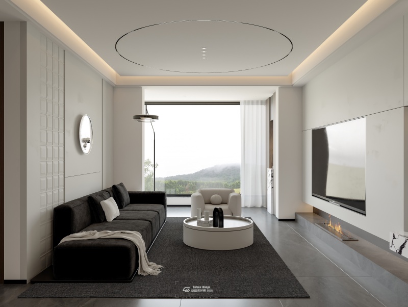 天花板的圓形線條與嵌入式筒燈、線性燈帶結(jié)合,豐富空間層次又顯精致。客廳區(qū)域,大白墻嵌入巨幕電視,下方嵌入式壁爐增添溫馨感,旁側(cè)開放柜體陳列物品,兼具收納與裝飾。
