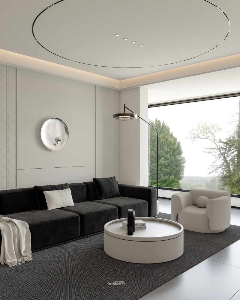 以黑白灰為主色調(diào),簡潔大方。黑色 L 型沙發(fā)搭配淺色抱枕、毛毯,柔和空間。圓形白色茶幾造型簡約,上方小擺件增添精致感。