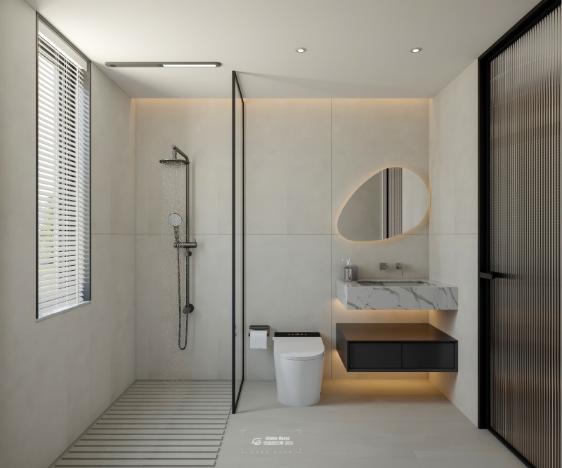 玻璃隔斷劃分淋浴區(qū)與干區(qū),利落干脆。懸浮式洗手臺搭配大理石紋理臺面,橢圓鏡嵌入墻中,下方燈帶增添精致感。