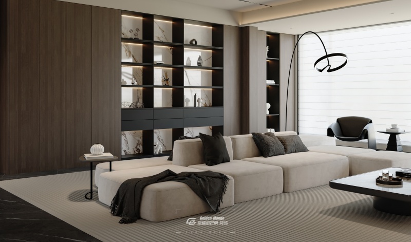 黑色地磚與灰色地毯的搭配,低調中透著奢華,而淺色沙發搭配不規則大理石茶幾,圍合出一個溫馨而時尚的交流空間。落地窗引入充足自然光,光影交織間,讓整個空間充滿生機與活力。