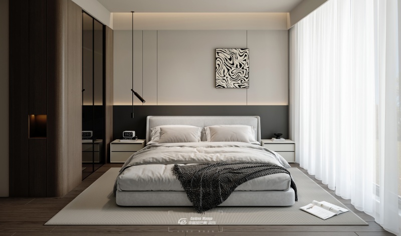 臥室是現代美學的完美體現,以簡潔的線條和柔和的色彩營造出寧靜而舒適的氛圍。背景墻采用深色木質與白色飾面拼接,搭配內嵌式燈光,展現出主人對生活品質的追求。床頭兩側的吊燈設計感十足,暖黃光暈下,盡是溫馨與安寧。步入式衣帽間與臥室相連,衣物、配飾有序陳列,既滿足收納需求,又彰顯主人品味。