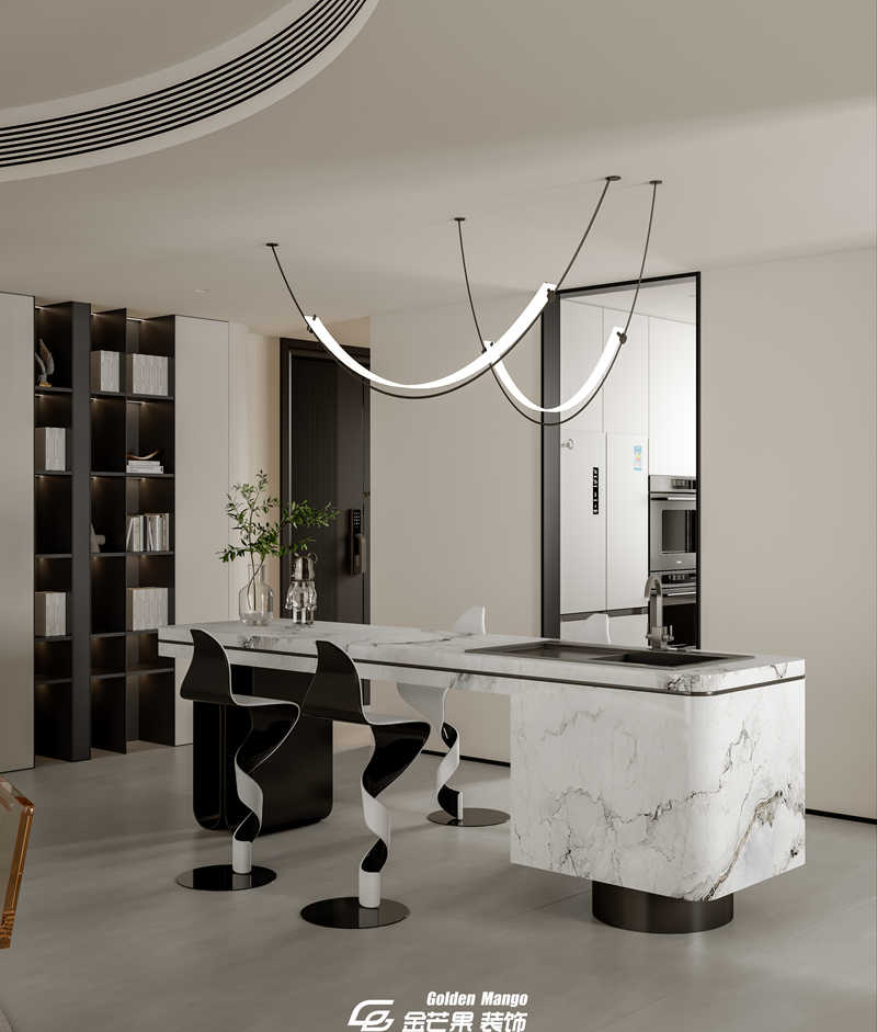 n 從客廳步入餐廳,視野豁然開朗。金芒果的設計師將餐廳與廚房打通,用一個中島臺作為自然過渡,既增強了家人間的互動,又讓空間顯得更加通透。餐桌的選擇堪稱點睛之筆—— 一張長度 2.2 米的巖板餐桌,搭配 6 把淺灰色皮質(zhì)餐椅,簡約中透著高級感。餐桌上方懸掛著一盞造型獨特的吊燈,黑色金屬框架搭配白色燈罩,燈光灑下時,給食物鍍上了一層溫柔的濾鏡。