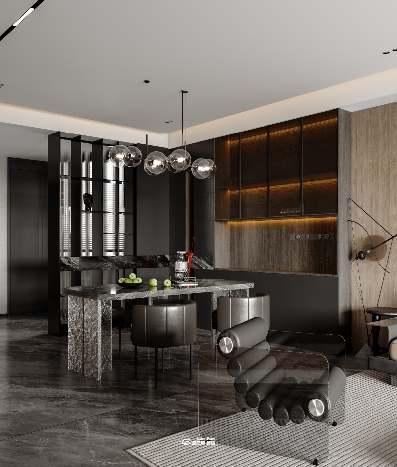 餐廚區(qū)以深色木質(zhì)高柜為背景,搭配內(nèi)嵌式暖光燈帶,營(yíng)造出沉穩(wěn)內(nèi)斂的氛圍。