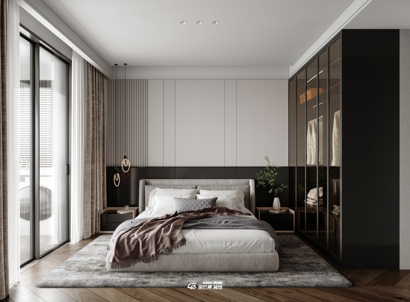 材質(zhì)選質(zhì)樸木色地板、柔軟地毯,搭配通透玻璃移門,引自然光入室。定制玻璃衣柜,實(shí)用又具展示性,綠植點(diǎn)綴添生機(jī),整體簡(jiǎn)約舒適,盡顯意式 “少而精” 的美學(xué)。