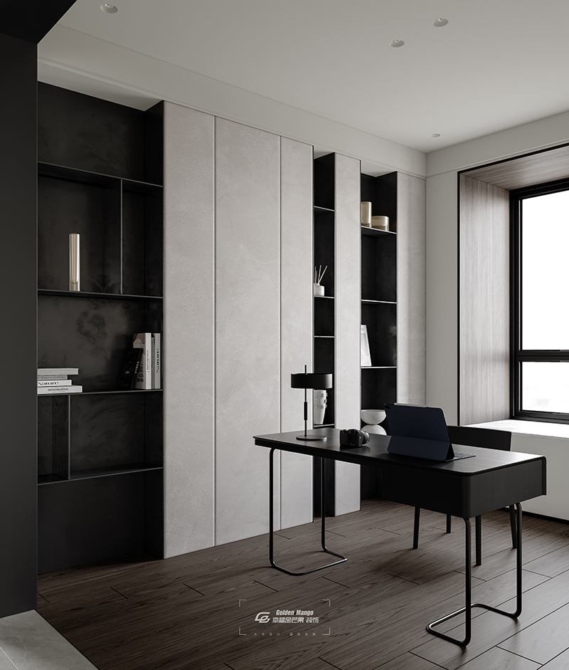 書房的空間不算大,愣是給裝出了格調。黑灰白的色調,簡約又高級。書桌是黑色臺面搭配金屬桌腿,上面的臺燈一開,光都帶著高級感。桌是黑色臺面搭配金屬桌腿,上面的臺燈一開,光都帶著高級感。