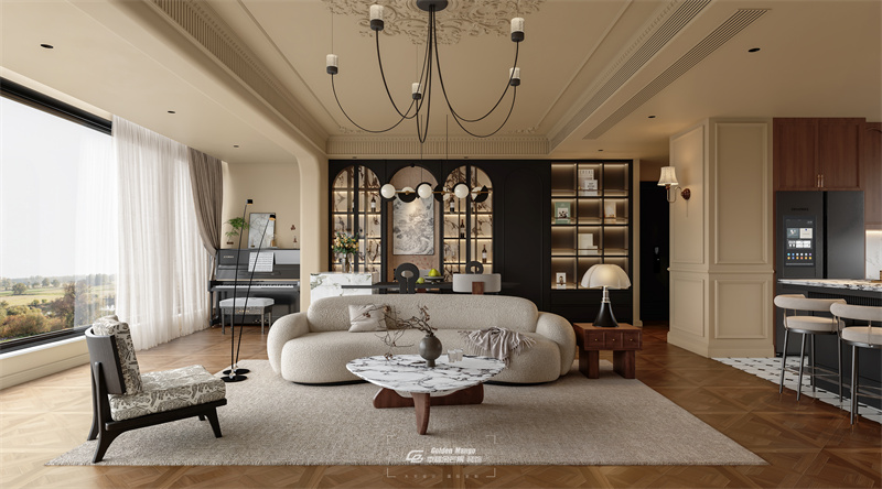 淺米色墻面搭配精致雕花,營造優雅基調。拱門造型與復古吊燈,增添浪漫氛圍,弧形沙發、藝術茶幾柔化線條,鋼琴與酒柜區域,融合藝術與生活,大窗引入自然光線,整體呈現出浪漫、精致且舒適的法式居住氛圍