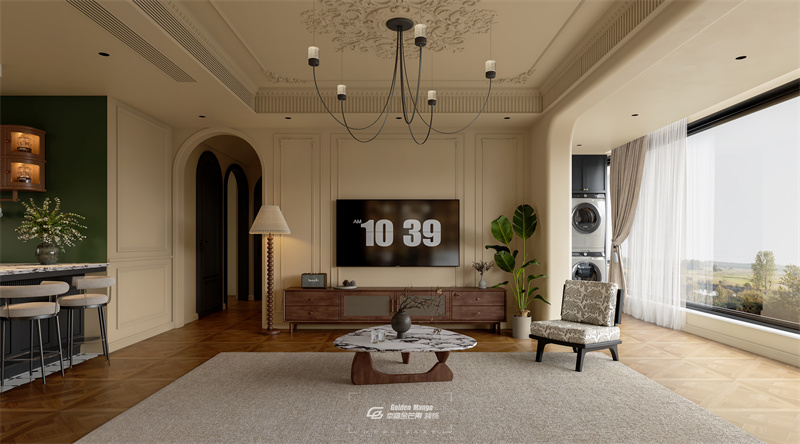 整體以柔和米色為主色調,搭配雕花吊頂、石膏線護墻勾勒優雅輪廓,拱門設計增添浪漫韻味。開放式布局串聯起客廳與休閑吧臺,復古吊燈、木質電視柜、花紋單人椅等家具,融合經典元素,大理石茶幾與綠植點綴提升精致感。大面積落地窗引入充足光線,延伸空間同時借景窗外,營造出兼具優雅懷舊與舒適愜意的居住氛圍