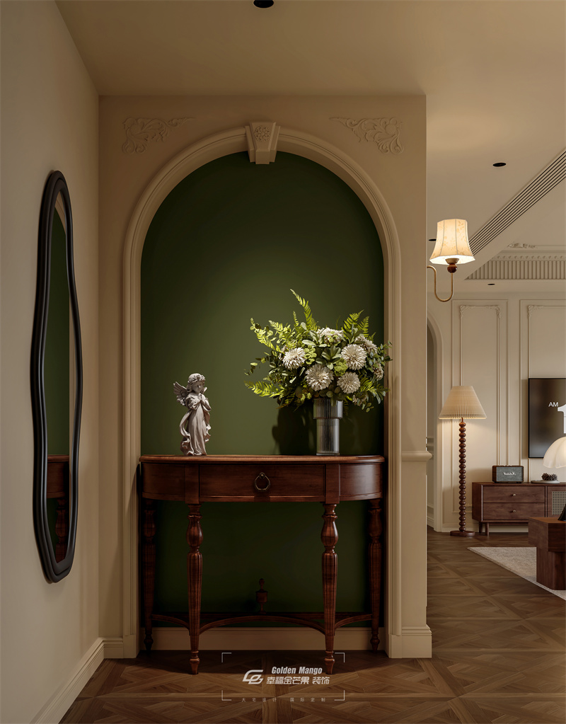 以米色墻面搭配墨綠色背景墻,營造優雅氛圍。拱形門洞、雕花裝飾融入經典元素,木質半圓玄關桌實用美觀,天使雕塑與花藝點綴增添浪漫精致感,側邊異形鏡豐富層次,整體呈現出兼具儀式感與藝術氛圍的過渡空間