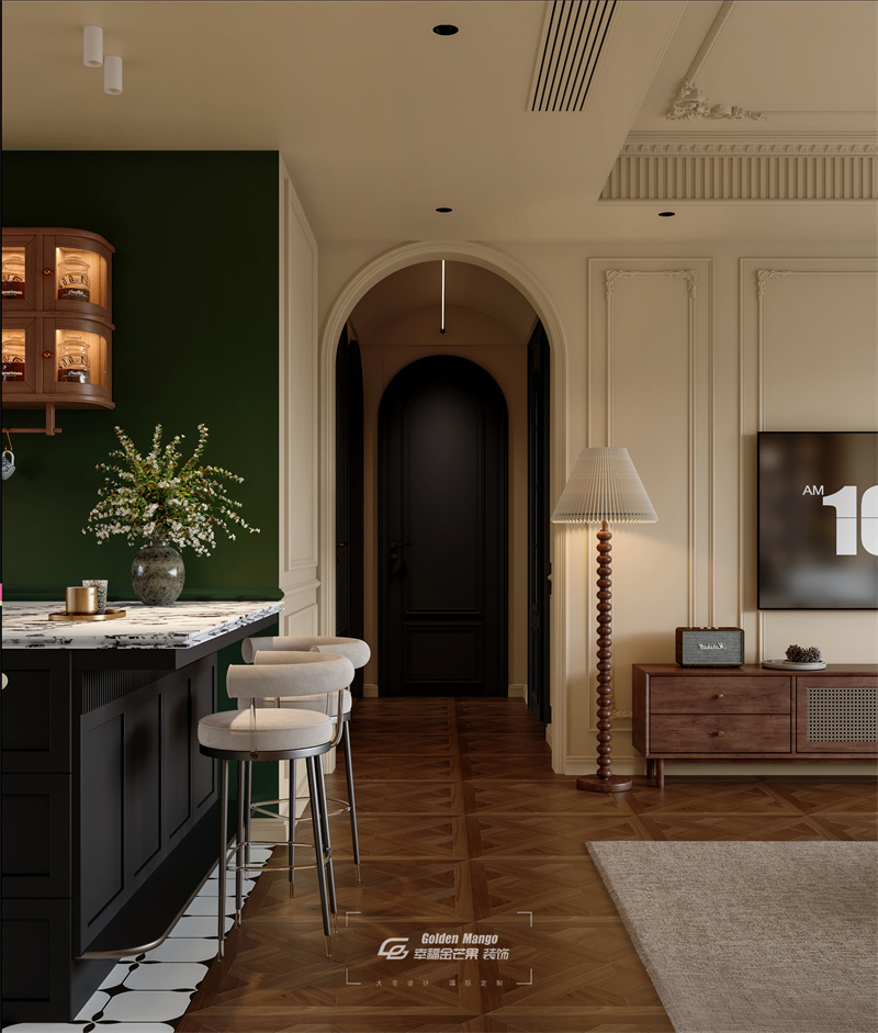 柔和米色鋪陳空間基底,一側墨綠色墻面跳脫又和諧。拱門元素串聯起不同區域,雕花吊頂、石膏線勾勒精致輪廓。吧臺以黑白配色呈現,搭配絨面吧椅,簡潔中透著時尚;綠植點綴、木質家具融入,賦予自然溫度。復古落地燈、做舊電視柜強化風格記憶,人字拼木地板豐富視覺層次,整體營造出浪漫經典又不失現代舒適的居住氛圍