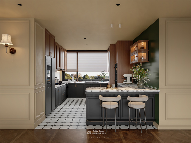 以米色護墻搭配墨綠色墻面,營造優雅復古氛圍。深色櫥柜與大理石吧臺質感十足,吧椅簡約時尚,墻面壁燈、木質吊柜增添細節溫度。大窗引入自然光線,窗外景色延展空間,人字拼地板與花磚地面豐富層次,整體呈現出兼具經典韻味與實用功能的烹飪休閑場景