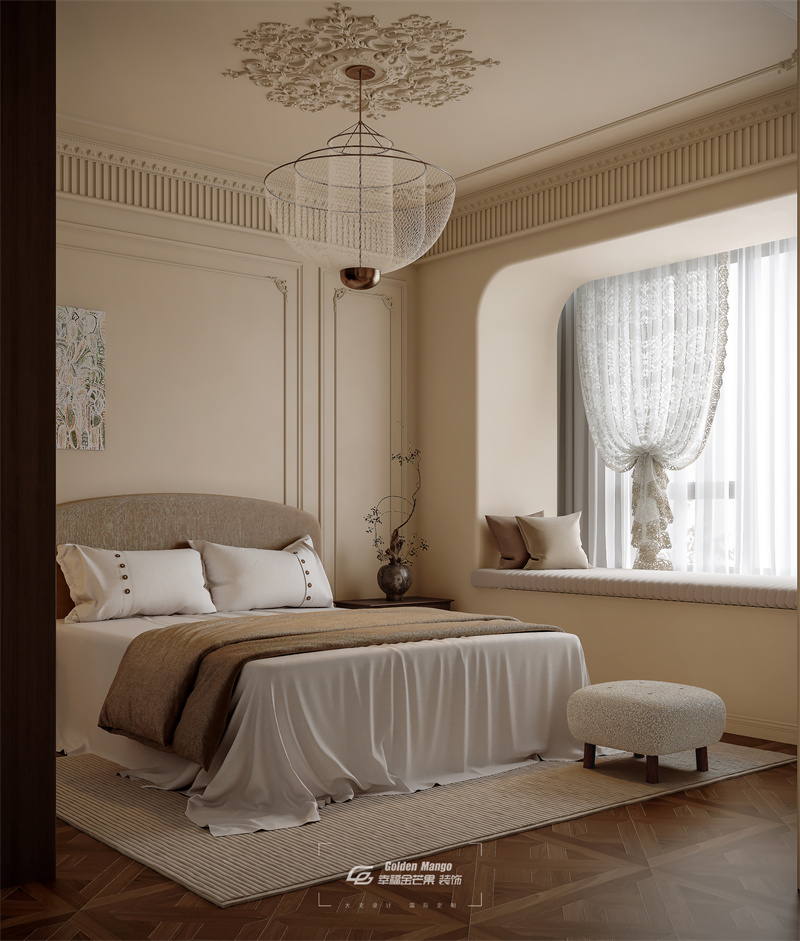 柔和米色為主調,雕花吊頂、石膏線護墻勾勒優雅輪廓。木質百葉衣柜兼具收納與美觀,復古吊燈、藝術掛畫增添氛圍,窗邊打造愜意飄窗,床品、家具選品溫潤,整體營造出浪漫經典又舒適靜謐的休憩環境