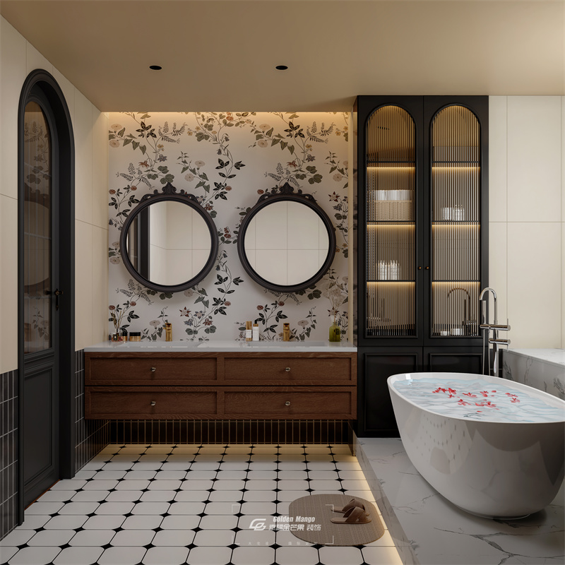 以米色為主調,搭配花卉壁紙增添浪漫。拱門、雕花鏡、木質臺盆柜融入經典元素,玻璃收納柜帶燈光設計,實用又美觀。黑白花磚、獨立浴缸,營造出優雅精致且具儀式感的洗漱沐浴場景