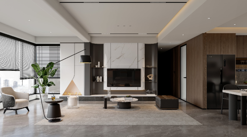 淺灰大理石地磚配同色系地毯,延伸空間感。右側木飾面與深色家電銜接餐廳,整體通過材質拼接、色彩協調,打造出精致舒適、契合當下審美趨勢的居住空間 。
