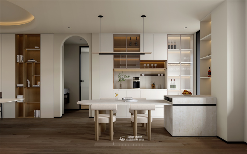 餐廚區采用開放式設計,讓空間感徹底解放。餐廳里,圓形餐桌柔化了線條棱角,搭配簡約長吊燈,“儀式感” 悄然流露;一旁的中島臺是 “多面手”—— 既是料理時的輔助臺,也是家人小聚的 “咖啡角”,擺上鮮果、杯盞,生活的小確幸便在光影里流轉。