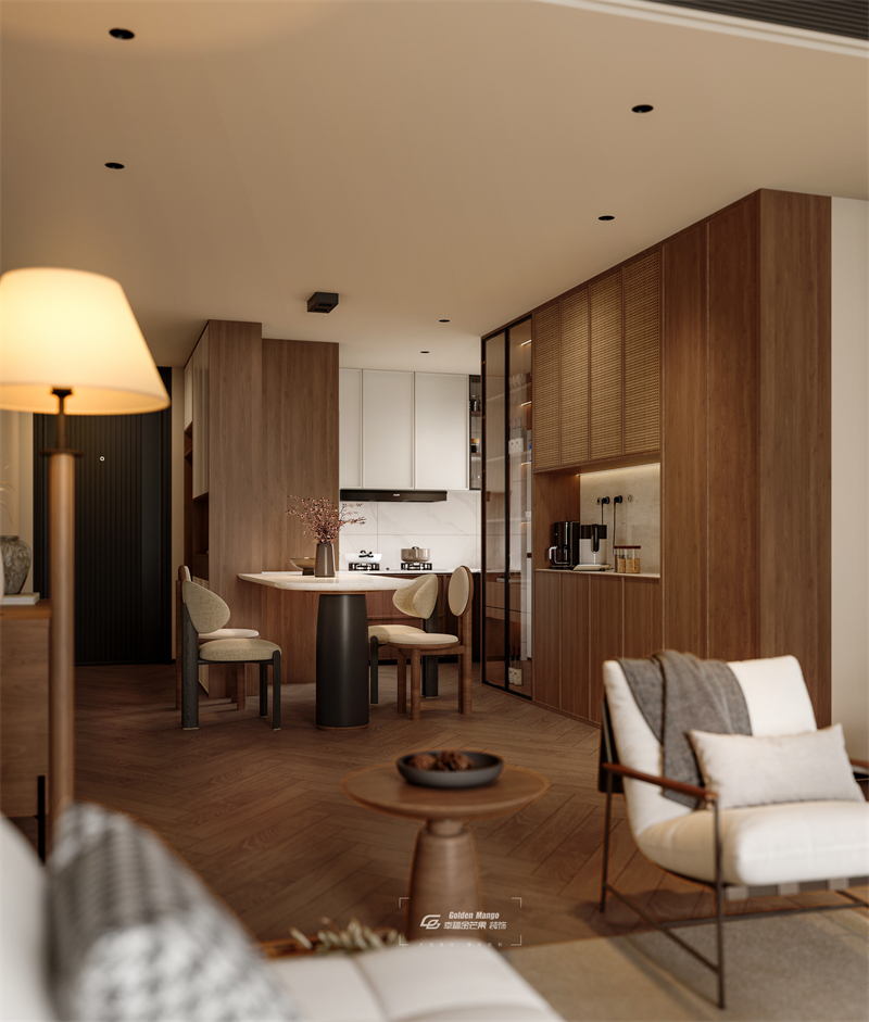 左側是入戶區域,設有帶燈光的儲物柜和掛衣區,方便收納衣物與隨身物品,細節處盡顯貼心。中間的餐廚空間,餐桌造型簡約,搭配造型別致的座椅,既適合日常用餐,也可作為休閑小吧臺。