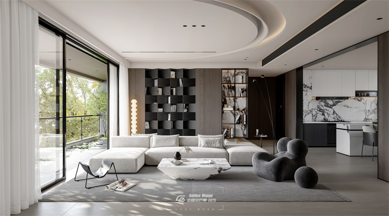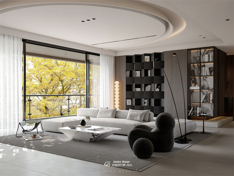 整體以黑白灰為主色調,營造出簡約高級的氛圍。大面積的白色用于沙發、天花板等,讓空間顯得明亮通透;黑色的幾何造型書架、獨特的休閑椅等,增添了視覺沖擊力與設計感;灰色的地毯、地面等起到了過渡與調和的作用。