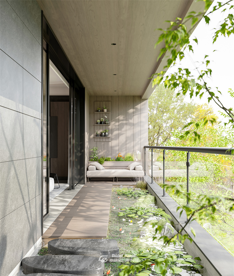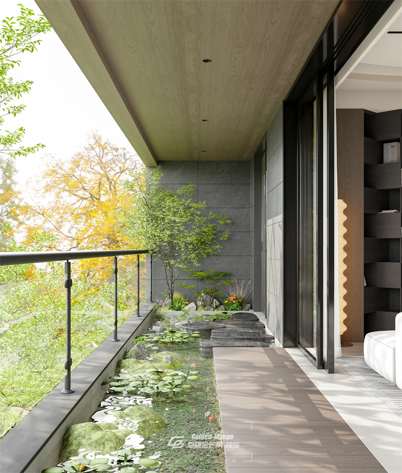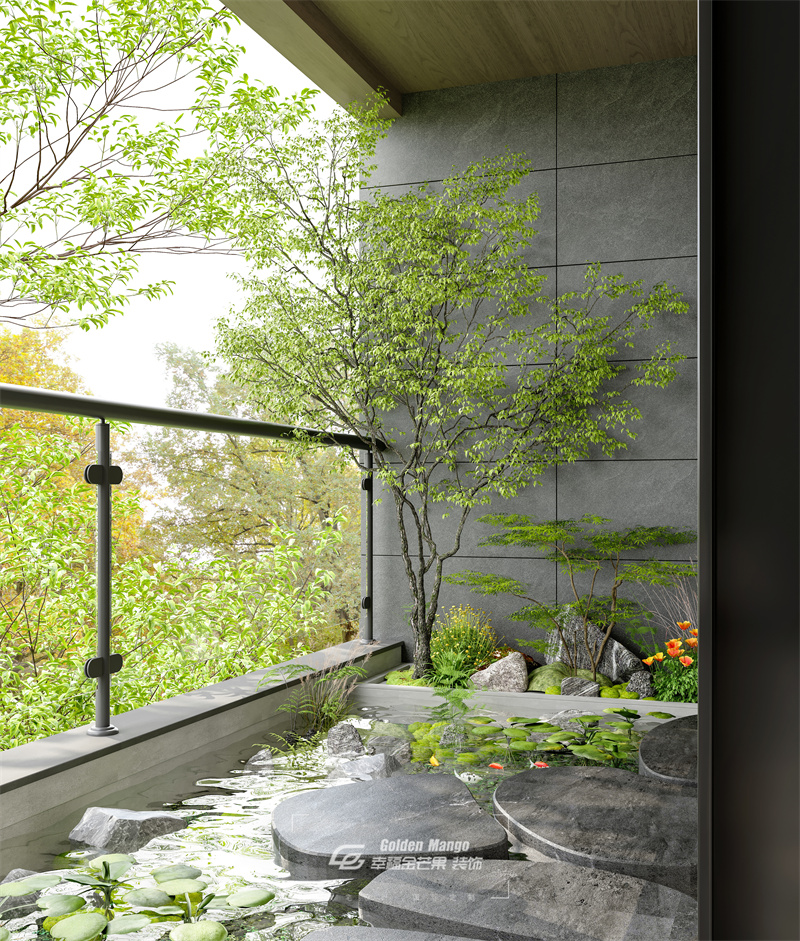 陽臺整體設計融合了自然元素與現代簡約風格。地面鋪設木質板材,帶來溫暖質樸的觸感。一側設有狹長的水景,水面漂浮著翠綠的荷葉,還有錦鯉游動,增添了靈動生機。水景旁布置著形態各異的石塊,搭配幾株綠植與小型樹木,營造出類似自然溪澗的景致。