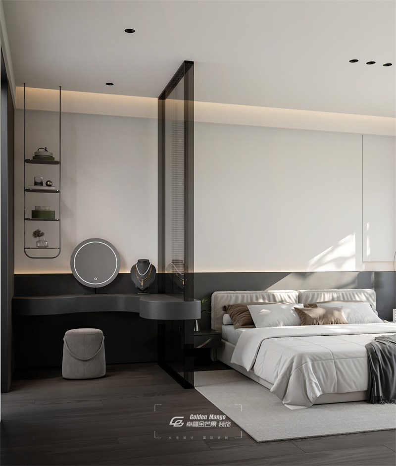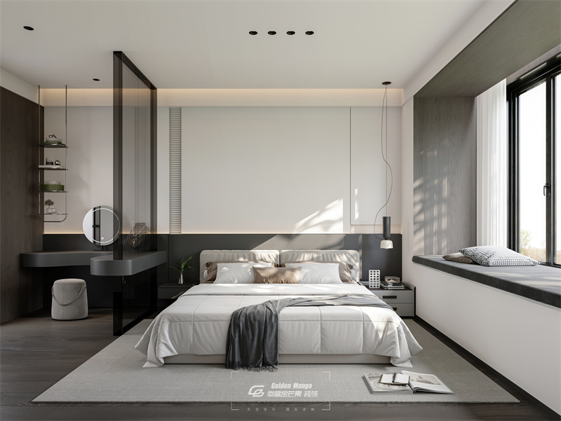 整體以黑白灰為主色調,搭配木質元素,營造出簡約又不失質感的空間。臥室中央是一張寬大的床,白色的床品搭配淺棕與灰色的抱枕,再搭上一條灰色毛毯,顯得柔軟舒適。床的一側有個小巧的床頭柜,擺放著臺燈和一些小物件,實用又美觀。