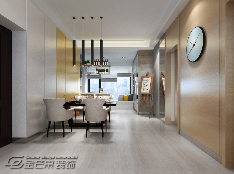 ▲ 餐廳地面通鋪淺灰色地磚,墻面木質(zhì)飾面板加上金色不銹鋼線條做點(diǎn)綴,讓空間簡(jiǎn)潔自然。