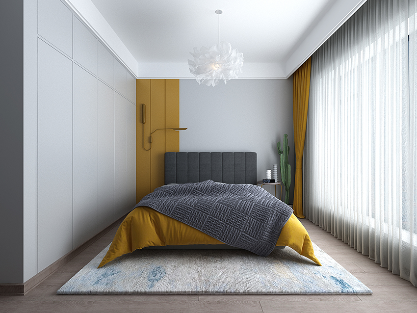 臥室整體以灰、白為基準色調,床頭位置則以深黃色點綴,這也是驚喜所在,當你晚上或者你想休息時拉上窗簾會發現深黃色變成了主要的顏色,溫暖而實在,從而入睡一整夜。巨大的衣柜則是讓你隨心買,我隨心裝。吊燈也是增添了幾分藝術氣息。