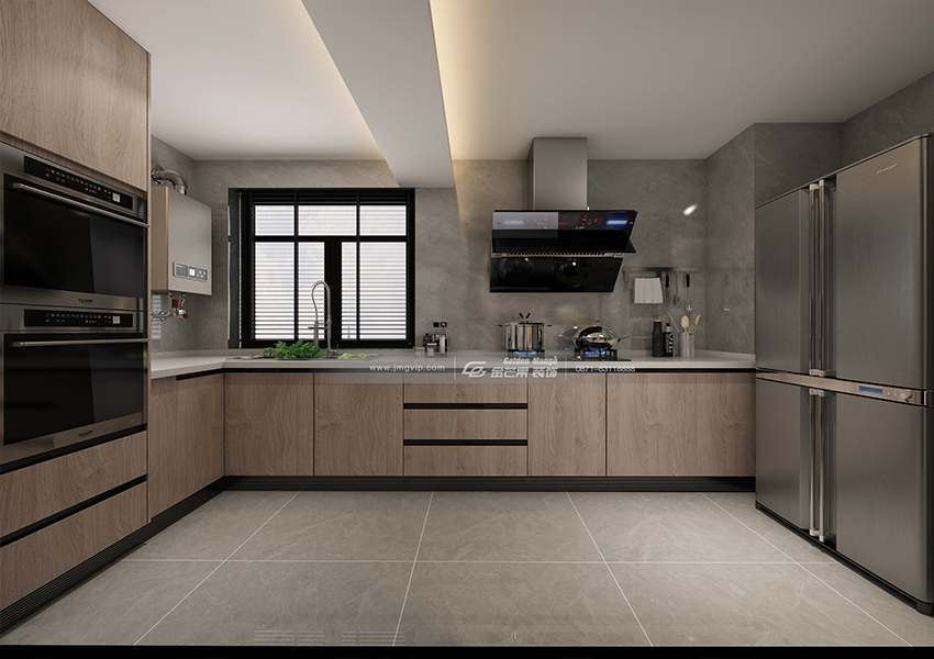 開放式廚房更顯主人的包容,L型的布局提升烹飪效率,選用灰色的地磚,干凈、美觀。雙開門的冰箱是新鮮蔬菜的一大保障。