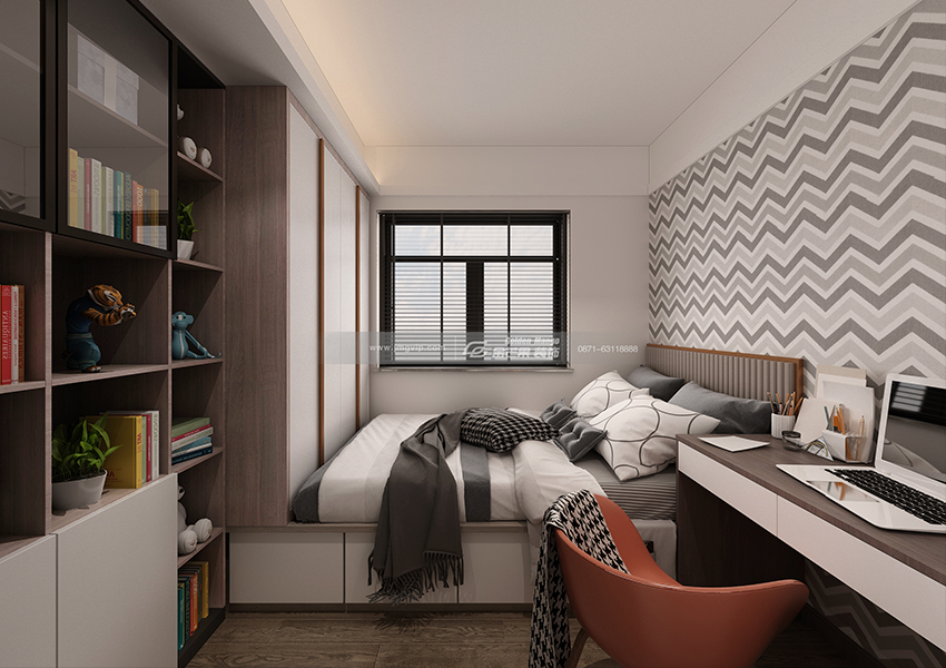 這個臥室合理的運(yùn)用了空間、提升空間的利用率。書桌也是學(xué)習(xí)、娛樂的地方,干凈、明了。小空間也有大的想象。
