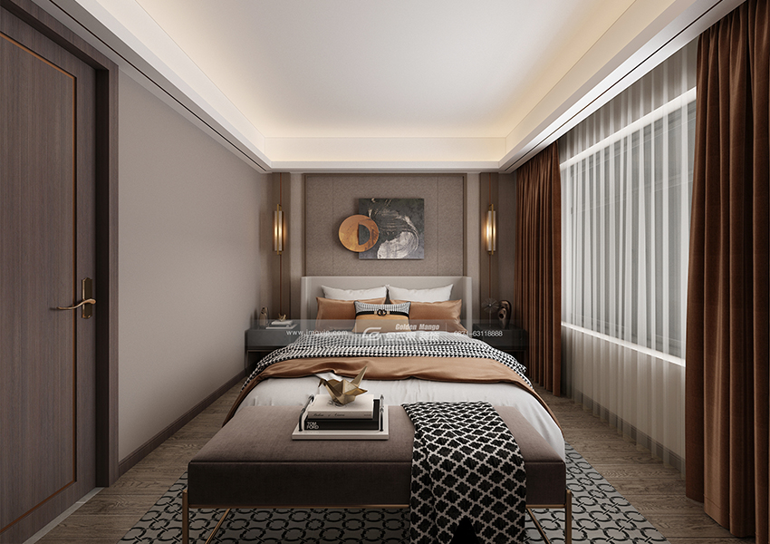 臥室并沒有吊燈之類的主燈,而是運(yùn)用燈帶加以代替,在保護(hù)眼睛的同時也有不錯的照明。床頭壁畫也是中式風(fēng)格的體現(xiàn),深色的窗簾也是睡眠的一大保障。