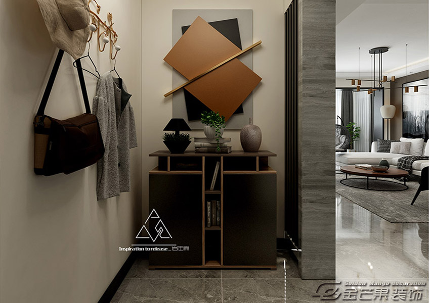 避免了進門直面客廳或房門,簡單的衣帽掛鉤更實用方便。墻上的圖案具有強烈的設計感和抽象色彩。