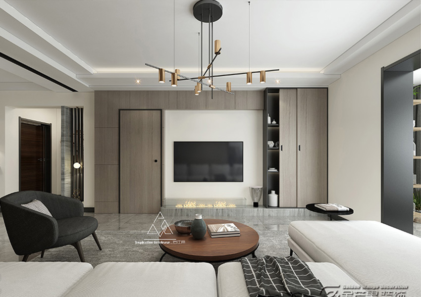 電視背景墻沒有過多地裝飾,房間門巧妙和背景融為一體,加上黑色邊框更加顯眼也和另一面的柜子形成呼應效果。吊燈加入線條元素,單一而不平凡,沙發的風格也恰到好處的和空間融合。整體顯得寬敞、明亮。