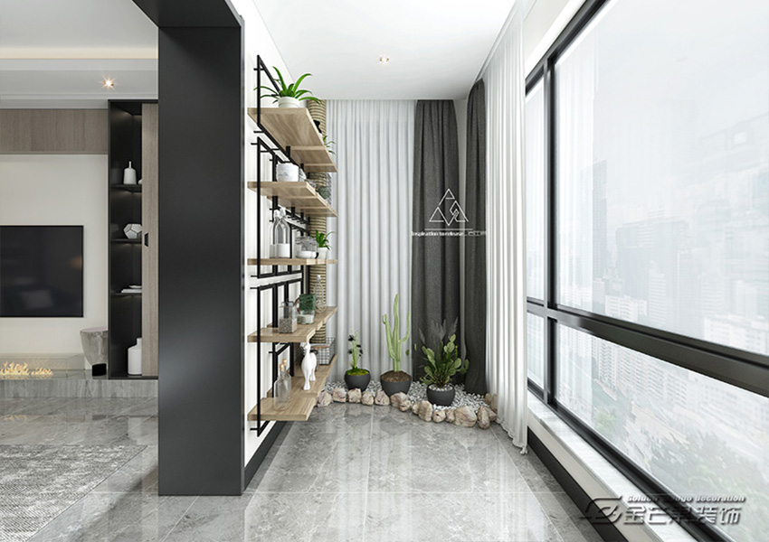 陽臺盡顯主人的閑情雅致和樂趣。種類繁多的盆栽,精美的鵝卵石。白色窗簾純凈、黑色窗簾深邃。