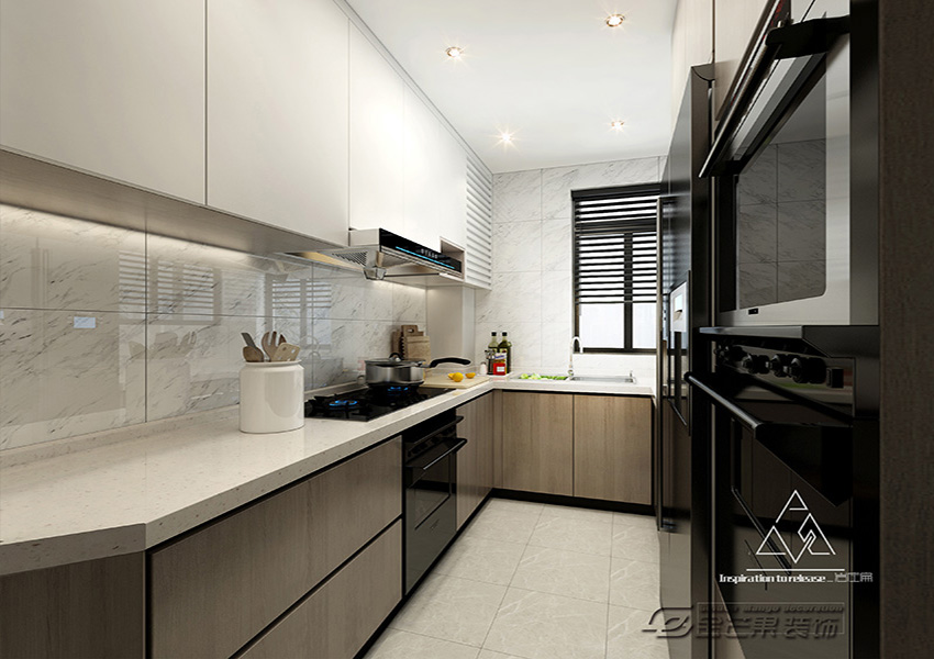 廚房表現出設計師的用心之處,冰箱、烤箱配色為高冷的黑色,乳白色的操作臺和儲物更顯得干凈,污漬無殘留。動線合理,在儲物柜下方留有燈帶,無論是切菜還是炒菜,更放心。