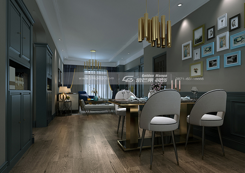 簡單明快也是美式風(fēng)格的體現(xiàn),客廳和餐廳吊燈相互呼應(yīng),巧妙的隱藏了主燈,保證了充足的光照,做到只見光不見燈的效果。