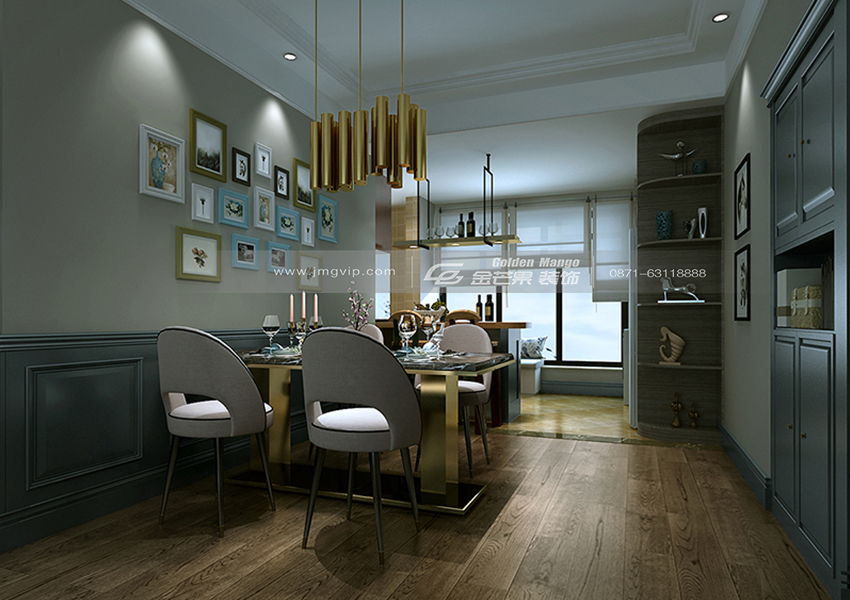 在這個(gè)案例中,一抹淺綠色貫穿著整體。美式風(fēng)格總是給人自由、隨意不羈的生活態(tài)度。在點(diǎn)滴之處也融入了些許巴洛克風(fēng)格的裝飾,奢侈、高貴。