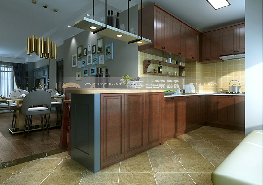 酒紅色木質(zhì)的柜體盡顯高貴氣息,土黃色的地磚和墻面,簡單明了。開放式的廚房,粗礦大方。廚房一隅設(shè)有便餐臺,方便實(shí)用。