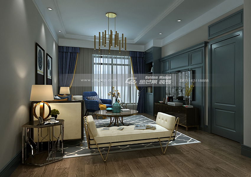 皮質(zhì)的沙發(fā),似有似無的燈光,也是美式風(fēng)格的體現(xiàn)。淺綠色的電視背景墻,更加愜意的田園生活。