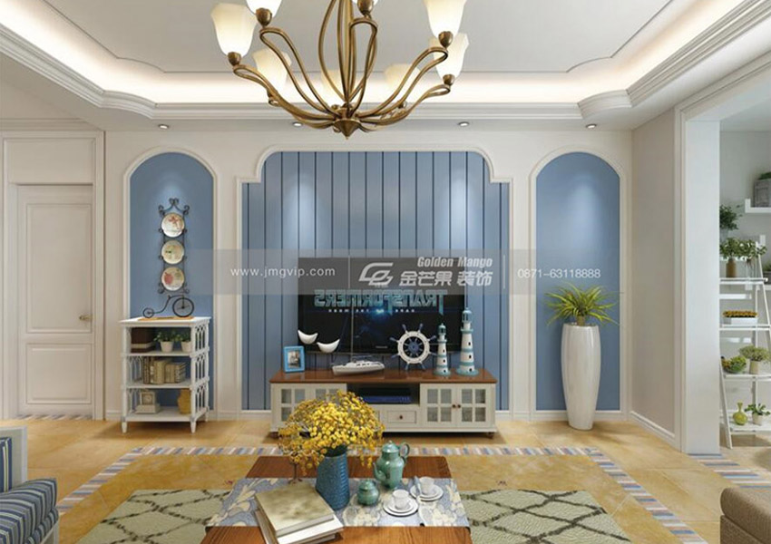 純凈淺藍色的背景墻,其中以線條元素裝飾,更顯清晰明了,綠植不乏對自然氣息的向往。