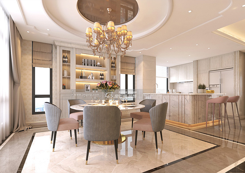 廚房、餐廳整體的布局更顯寬敞、大方。開放式的廚房加上大理石鑲邊的島臺,豪華的標配。餐廳的燈具已然成為一件藝術品,頂被圓形嵌套包圍,搭配上圓形的餐桌,寓意團團圓圓,美美滿滿。地面方正形狀嵌套,代表著工工整整、和和諧諧。柜體上珍藏的美酒,也成為了生活的美妙之處。