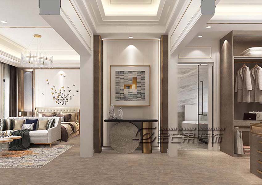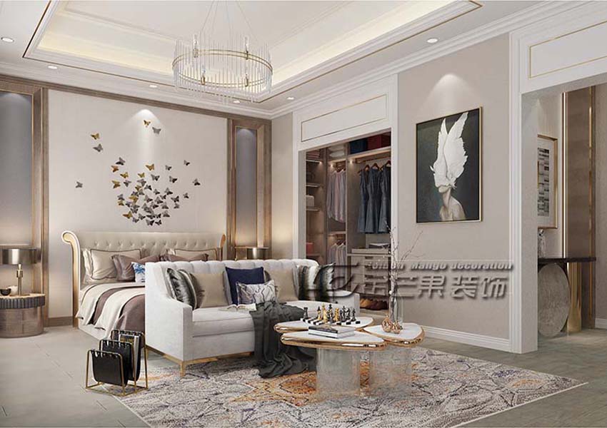 臥室極力打造一個(gè)個(gè)人的私密空間,融入衣帽間、衛(wèi)生間相互之間的影響更小,空間上更寬敞,床頭墻壁上的蝴蝶,增加浪漫的色彩,吊燈充滿著強(qiáng)烈的設(shè)計(jì)感。