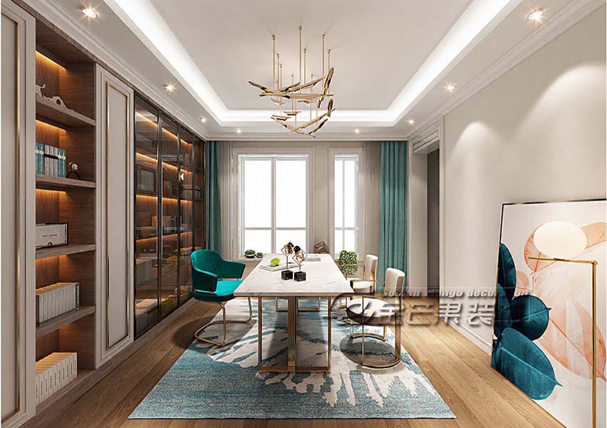 書房以清晰明了為主要主旨,燈光上減少暖色燈光的使用,更能集中精力到學(xué)習(xí)和工作中。柜體更時(shí)尚,分類更清晰,儲(chǔ)藏更方便。色彩搭配鮮明。