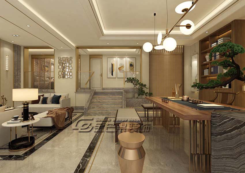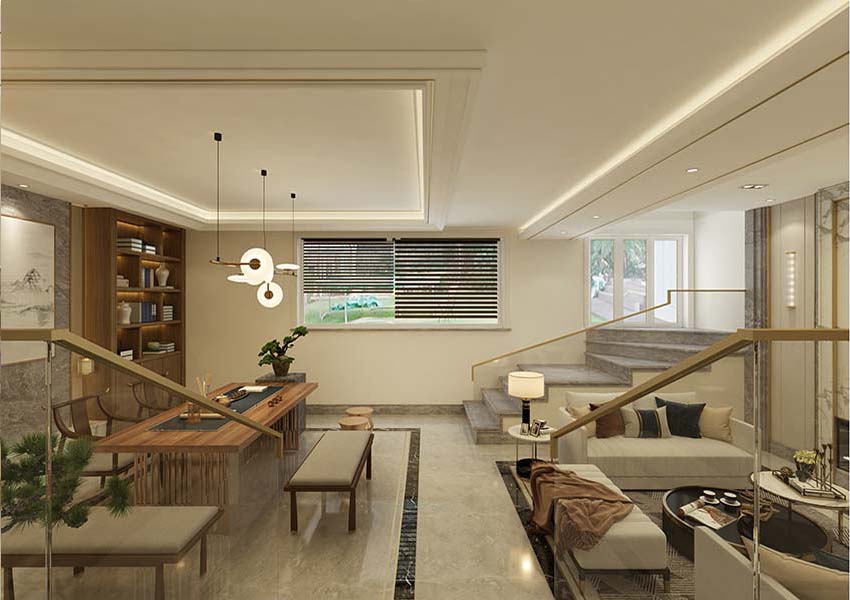 在茶室區(qū)有著強(qiáng)烈的中式味道,品的是茶,品的也是人品,更是待客之道。案桌上的云客松,也是主人對(duì)待客人的態(tài)度。在屋頂以燈帶和線條元素作搭,層次更加清晰明了。