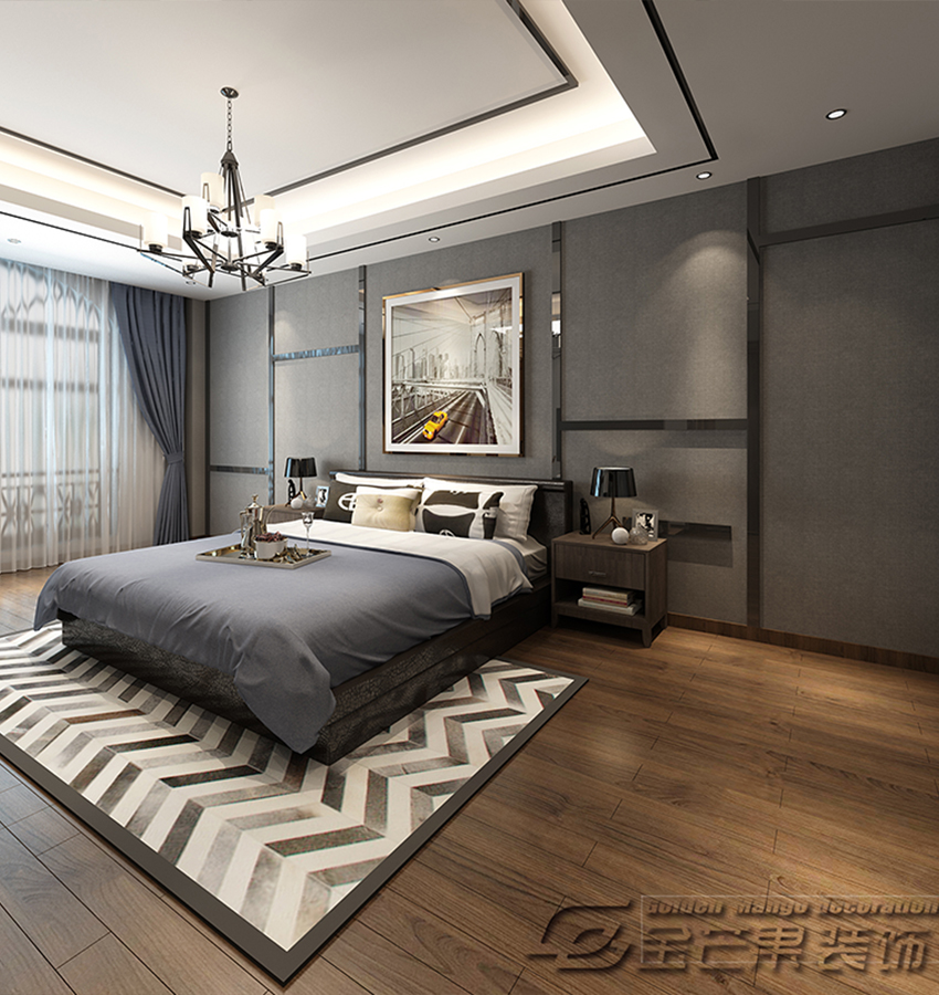 主燈和燈帶,加上灰色的搭配,保證著休息上的保障。實木的地板更加有親密的感覺,豐富的線條元素,層次鮮明。