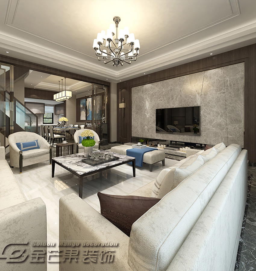 大量的大理石裝飾無疑給整體的品質(zhì)帶來很大的提升,實木包裹的電視背景墻,顯得內(nèi)斂奢華。一抹淺藍(lán)色,清新淡雅,在吊燈上選擇上更顯氣質(zhì),軟裝的優(yōu)雅、貴氣一一顯現(xiàn)。