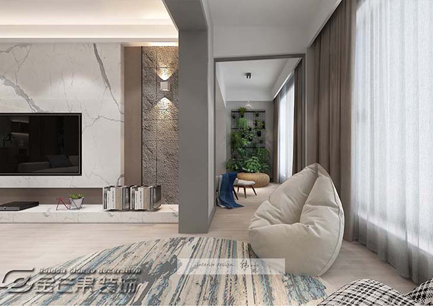 整個空間沒有主燈的設計,顯得平易近人,電視機鑲嵌到墻體里面,落地的電視柜設計顯得時尚前衛。陽臺布置兩個懶人椅,增加生活上的體驗,沙發風格的選擇完美的契合了整體,在電視背景——大理石的作用下,整體顯得優雅范十足。長條陽臺增添了生活樂趣的更多可能。