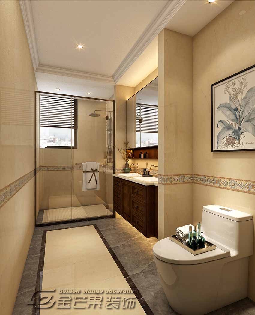 奢華,干濕分離的衛(wèi)生間顯得整潔和美觀,為防止淋浴時滑倒,在淋浴間放置貼心的防滑墊。酒紅色的柜體顯得醇厚、高貴。空間使用上更加的寬松,黃色瓷磚鑲成的墻面和燈光恰好搭配,窗子在保證了采光和通風(fēng)。寬大的鏡面,審視著鏡中人。