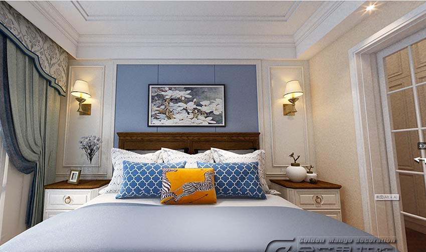 床頭運用更加新穎的風(fēng)格,清新的淺藍色映入眼簾,壁燈怎顯得格調(diào)十足,和客廳一樣的窗簾設(shè)計。